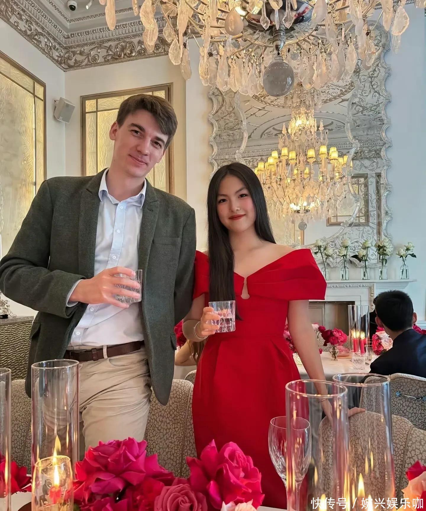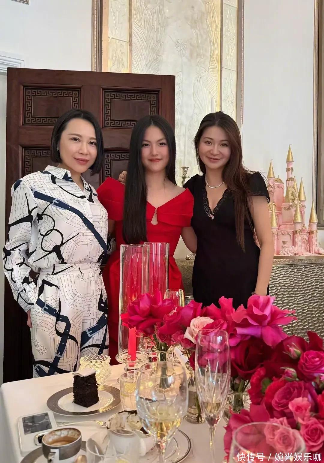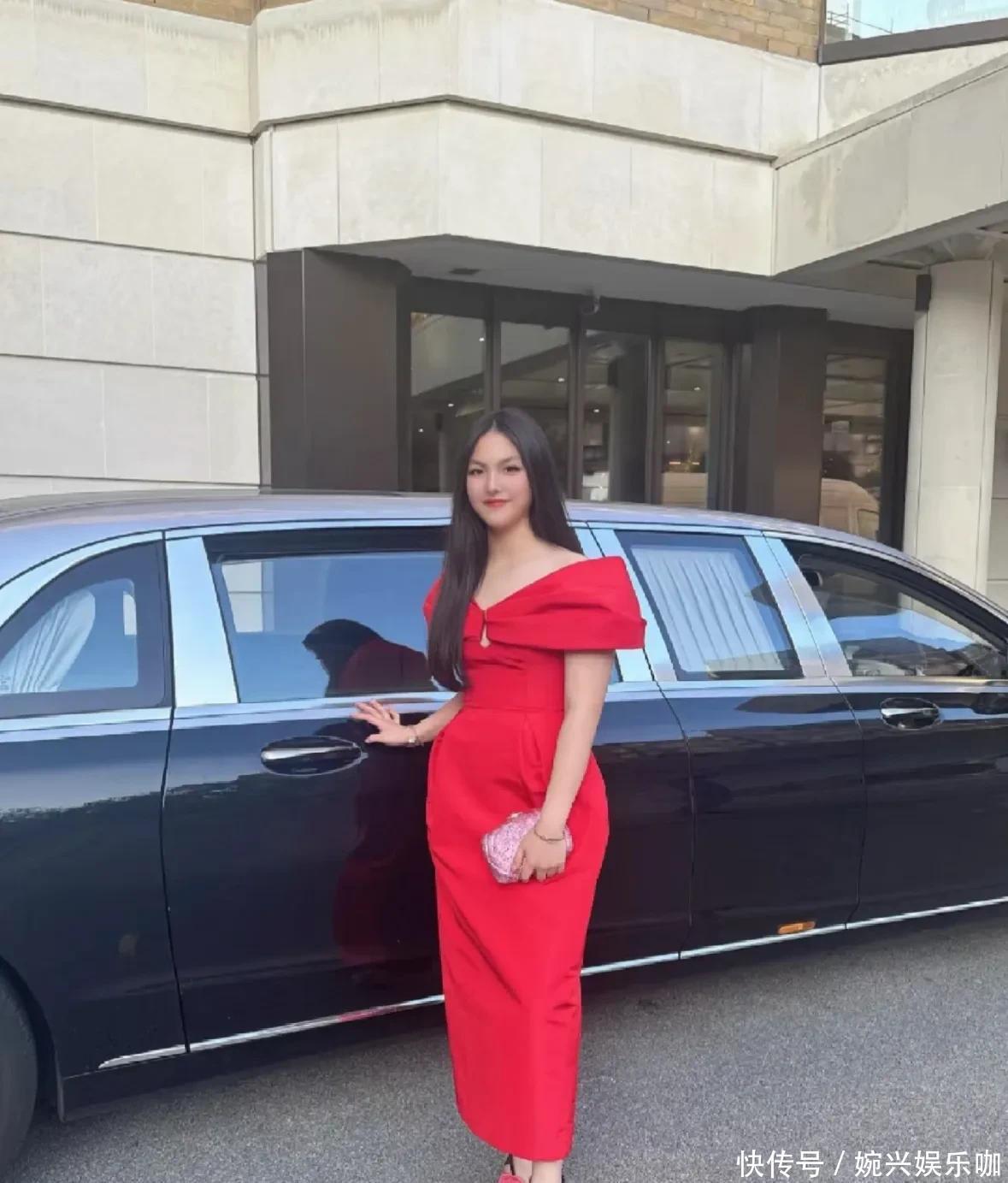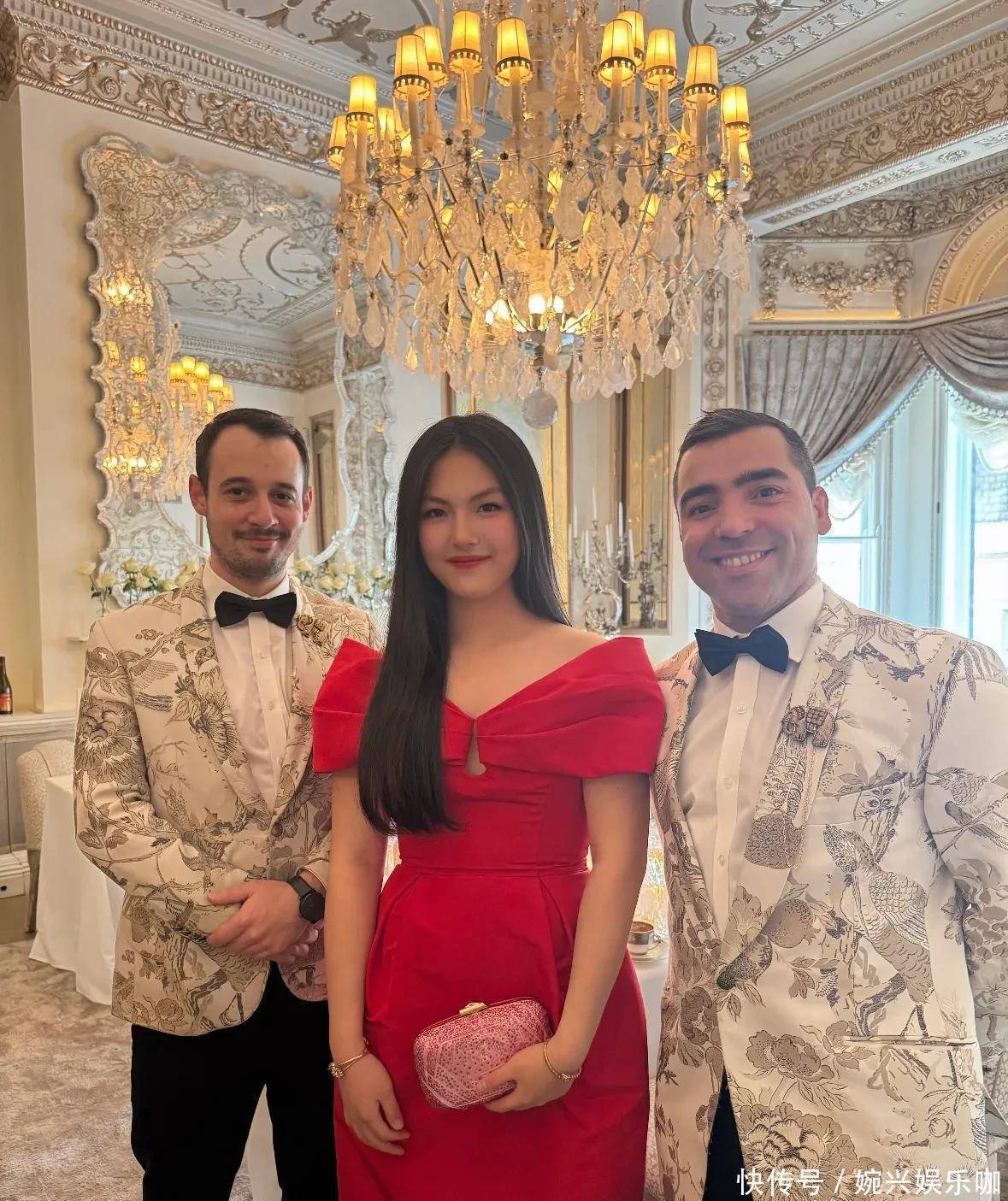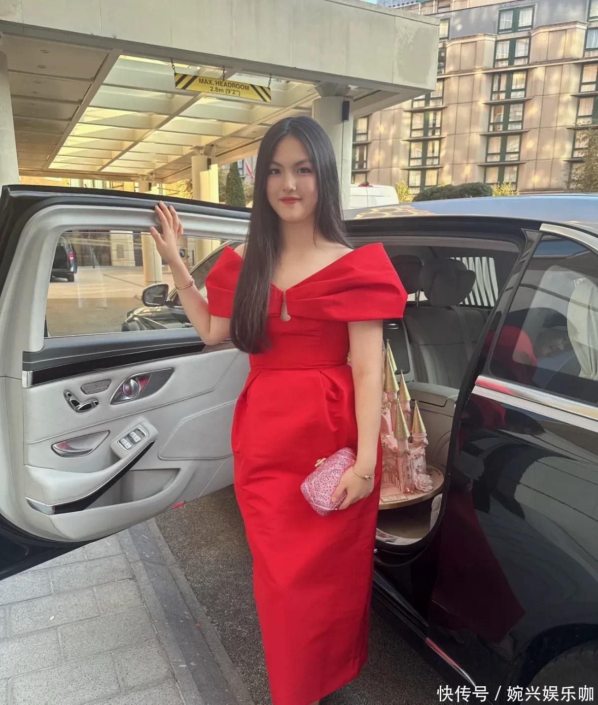 王诗龄穿着鲜艳的露肩红色礼服裙,中分黑长直头发,名媛贵妇风的穿搭,肯定是妈妈李湘的审美。