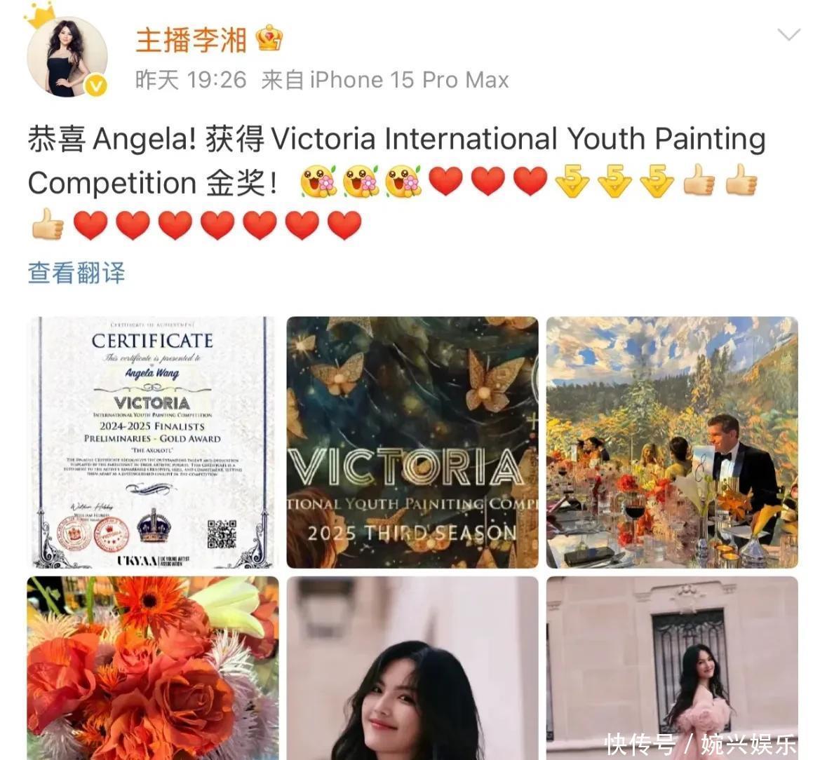 做传媒出身的李湘是懂得营销的,不解释不道歉,一边晒女儿绘画国际大赛金奖的证书,一边继续炫富。